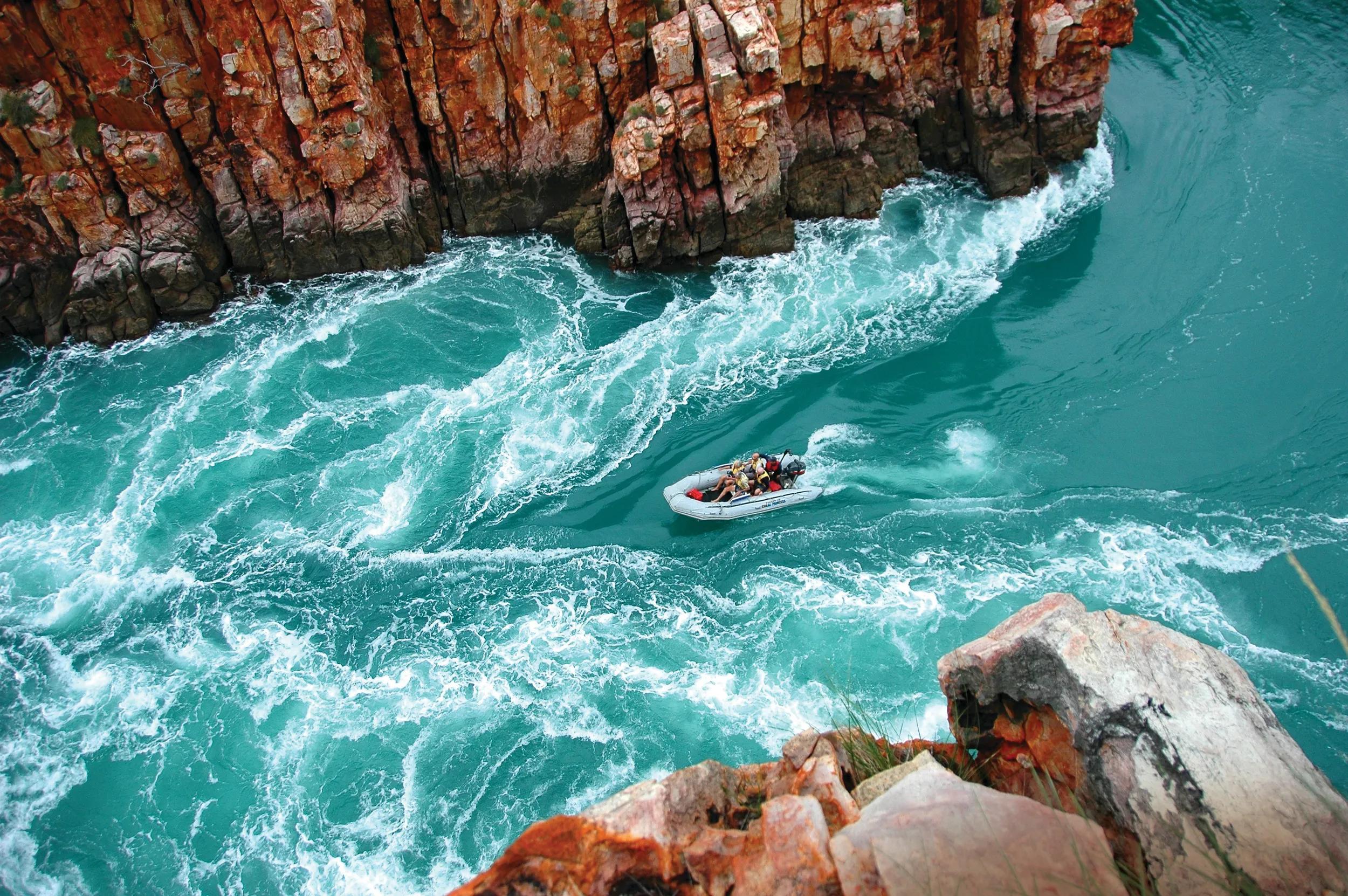 A low thrum builds as your Zodiac glides up the King George River. On either side, towering red cliffs rise from what looks like a depthless river, and mangrove forests sprout from the same brackish waters. Rounding a corner, the source of the noise materialises: King George Falls.